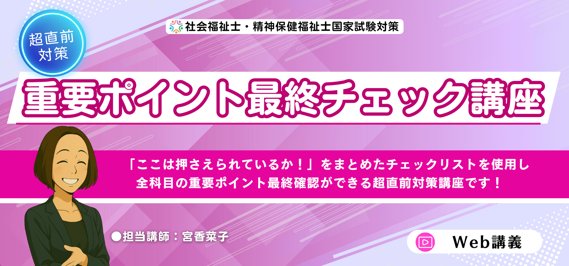 - 近年の社会福祉士・精神保健福祉士試験に関連する法改正の要点をまとめた「法改正レジュメ・解説講義」をプレゼント(法改正レジュメは11月頃データ配信予定)。