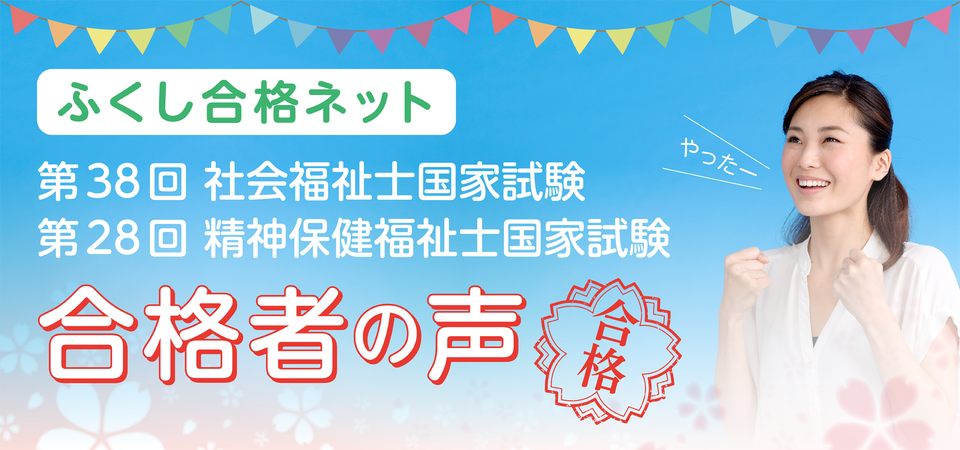 社会福祉士国家試験でもお世話になっていましたので、精神保健福祉士国家試験に向けても迷わずふくし合格ネットの海老澤先生にお世話になりました。昨年は1点に泣きましたが、おかげさまで今回は無事に合格する事ができました。教材の中で私が特に良かったなと思ったのが「重要ポイント画像でまとめ資料集」でした。要点が上手くまとめられていて分かりやすく、毎日持ち歩いて見ていました!なかなか覚えられない所も何度も繰り返し見る事で自然と頭に入っていたように感じました。 今回の合格にあたり海老澤先生をはじめスタッフの皆様には本当に感謝しています。 ありがとうございました!